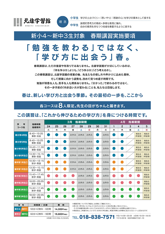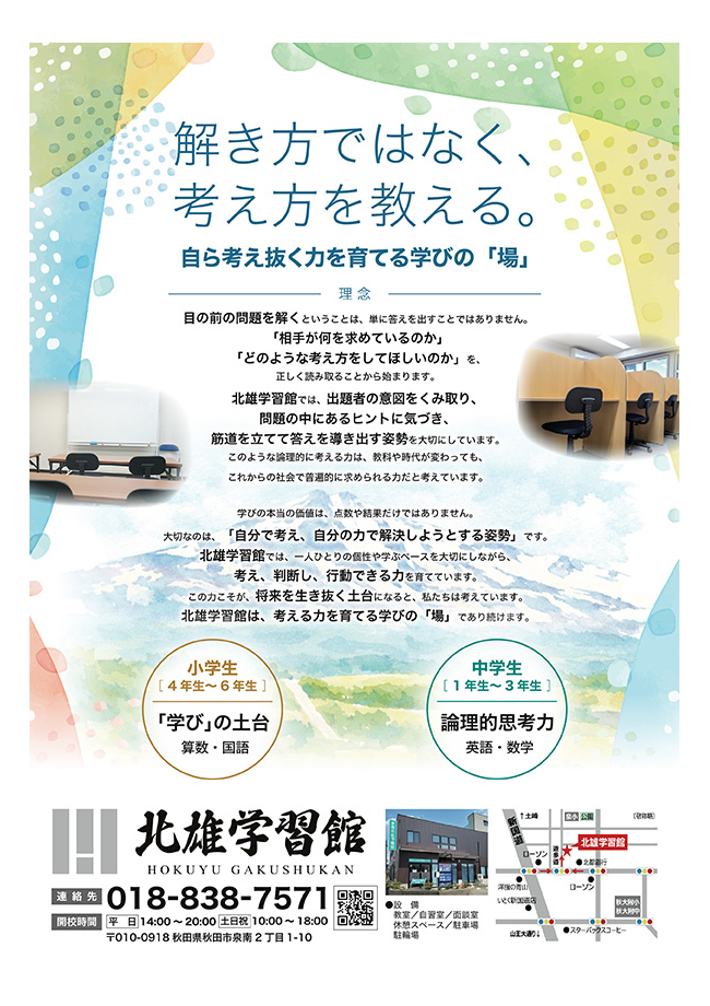 「北雄学習館」では、生徒一人ひとりの個性や学びのペースを大切にし、確かな学力の向上はもちろんのこと、自ら考え、自ら判断し、自ら解決する力を育む指導を心がけてまいります。また、保護者の皆様との連携を重視し、安心してお任せいただける環境を整えます。