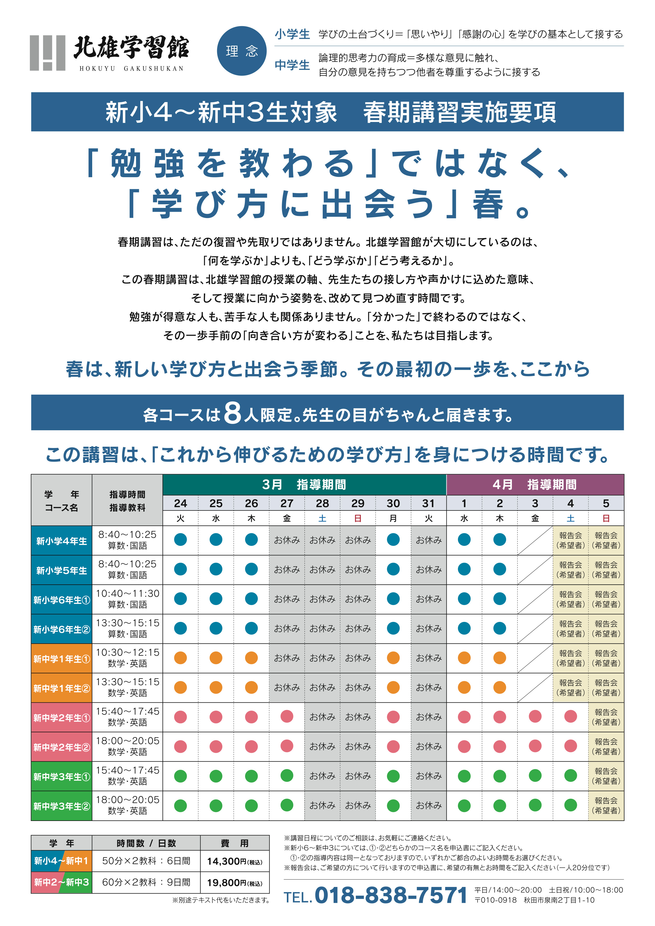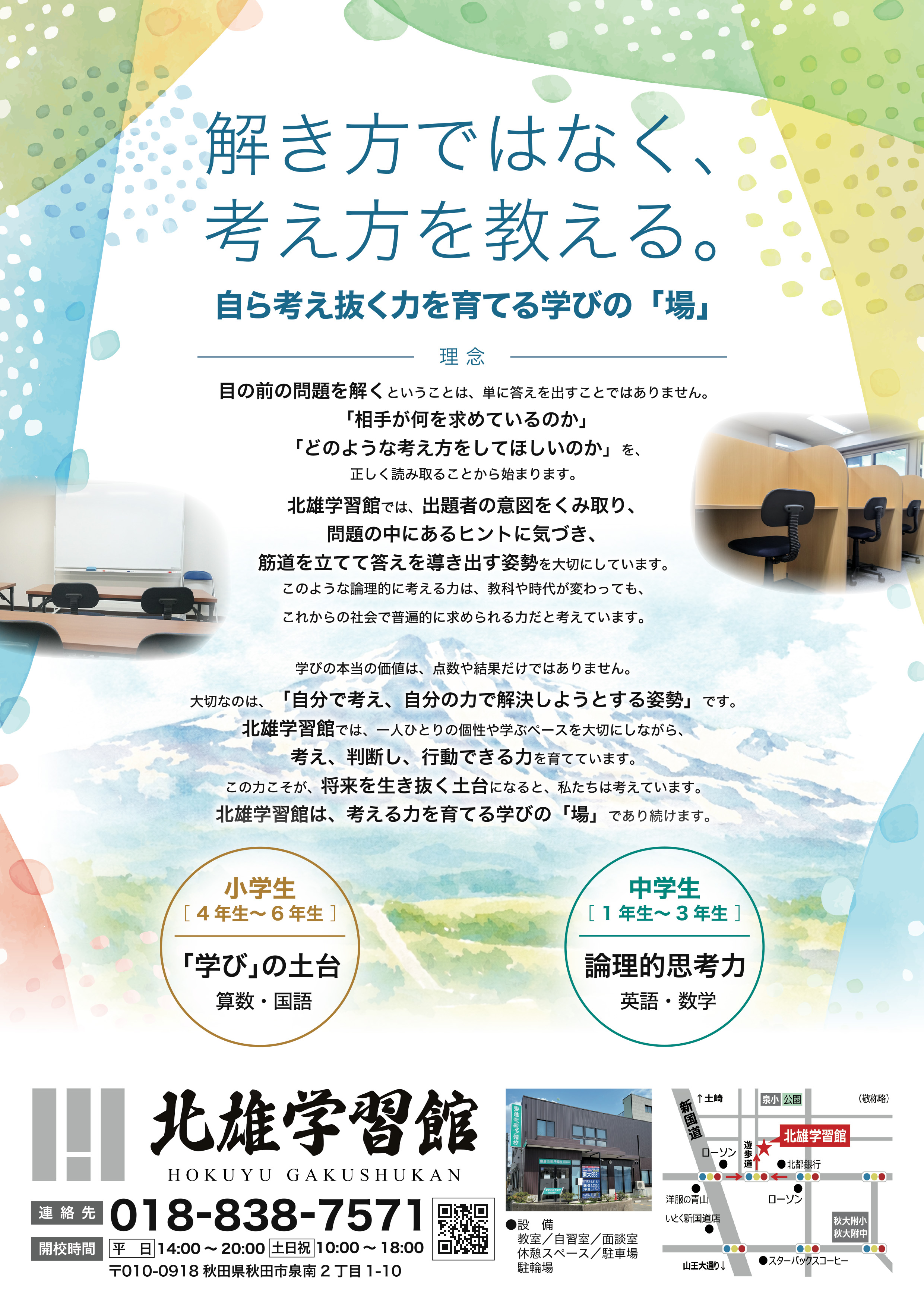 「北雄学習館」では、生徒一人ひとりの個性や学びのペースを大切にし、確かな学力の向上はもちろんのこと、自ら考え、自ら判断し、自ら解決する力を育む指導を心がけてまいります。また、保護者の皆様との連携を重視し、安心してお任せいただける環境を整えます。
